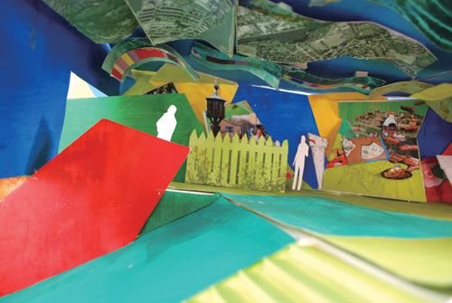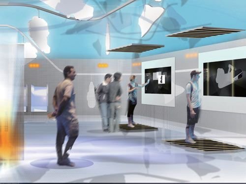 觀眾每二十人一組被請(qǐng)入展廳,穿過一個(gè)暗室,登上電動(dòng)滾梯,之后穿行于一條隧道。頓時(shí),“火車、汽車、公共汽車”交替出現(xiàn),廣播報(bào)站聲,鳥兒啾啾鳴囀,水上蕩舟的孩子們歡樂的笑聲不絕于耳——當(dāng)然,這只是一個(gè)用多媒體創(chuàng)意制作的美妙世界,指示著“你已進(jìn)入德國(guó)城市”。