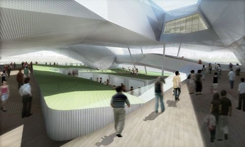 “活力廣場(chǎng)”是一處大廳,同時(shí)也是等候廳。這里呈坡型層層向上伸展著,透過一扇巨大的窗口及其半透明的墻外膜向外望,上海的藍(lán)天和展館前的小廣場(chǎng)盡收眼底。