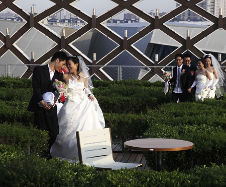 下午4點(diǎn),盛大的婚禮儀式正式開始。杰曼市長為新人們一一頒發(fā)其親筆簽名的世博婚典證書。接下來,新人參觀法國館,并在法國館江景園林餐廳——“第六感”餐廳,享用米其林星級大廚特為新人設(shè)計(jì)的全套法式浪漫大餐。據(jù)悉,婚禮新人的化妝、發(fā)型設(shè)計(jì)、攝像都來自法國。首屆世博浪漫婚典后,婚禮主辦方將繼續(xù)接受報(bào)名。
