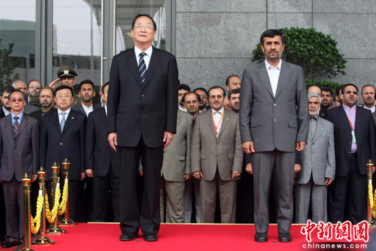 6月11日,伊朗總統(tǒng)艾哈邁迪·內賈德在上海世博園出席伊朗國家館日活動。圖為內賈德與中共上海市委書記俞正聲(左)出席伊朗國家館日升旗儀式。中新社發(fā) 湯彥俊 攝