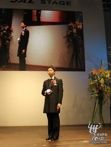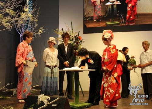 日本產(chǎn)業(yè)館JAL舞臺上,來自橫濱的新郎岡陽介身穿西式禮服首先登場。之后,同樣來自橫濱的新娘岡美緒身著正紅色、由3層衣服組成的日本傳統(tǒng)服飾――和服,腳踩木屐,在父親的引領(lǐng)下出現(xiàn)在觀眾面前。在兩位新人宣讀誓言、喝下交杯酒后,一位現(xiàn)場觀眾被邀請上臺作為證婚人之一,和新娘父母、主持人、歌手小松拓也一起在結(jié)婚證明書上簽字,見證兩人的結(jié)合。隨后,新人互換戒指,新郎向新娘送上深情一吻,至此,兩位新人正式結(jié)為夫婦,而現(xiàn)場觀眾也在此時送上了陣陣掌聲和祝福。