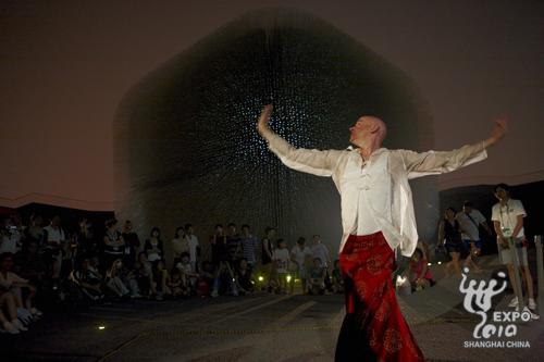 5日晚上,英國(guó)藝術(shù)家艾倫·格瑞格(Alan Greig)在“種子圣殿”前展現(xiàn)了精彩絕倫的蘇格蘭現(xiàn)代舞蹈藝術(shù)。艾倫 格瑞格是X Factor舞團(tuán)的藝術(shù)總監(jiān),他的舞蹈作品集運(yùn)動(dòng)、刺激與娛樂(lè)性于一體,此次演出片段是根據(jù)他在2009年上海舞蹈節(jié)中首演的獨(dú)舞《Into the Light》改編而成。