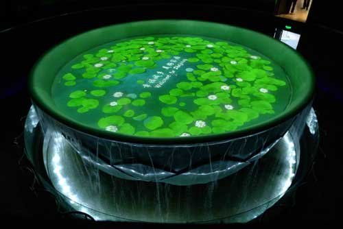 穿過綠盈盈的“竹林”,踏著還帶著泥土芬芳的青石板,一個(gè)似曾相識(shí)卻又全然陌生的江南小鎮(zhèn)呈現(xiàn)在眼前。在展館的中廳,位居中央直徑達(dá)8米的一只“青瓷巨碗”。在10分鐘的時(shí)間里,“河姆曙光”、“良渚筑城”、“天下糧倉”、“跨海天路”、“衣被天下”、“詩畫之路”、“錢江潮涌”、“城鄉(xiāng)同創(chuàng)”、“茶香悠遠(yuǎn)”等十幕實(shí)景,用獨(dú)特的手法在“青瓷巨碗”中一一展現(xiàn)。