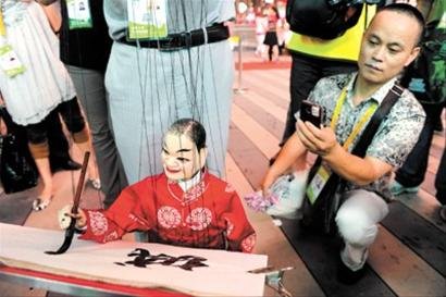 昨天,來自福建省連城縣的木偶表演藝術(shù)家李明卿在世博會寶鋼大舞臺用手中的提線木偶揮毫寫下了“城市,讓生活更美好”的世博會主題,讓在現(xiàn)場觀看的游客驚嘆不已。 本報記者 張馳 攝