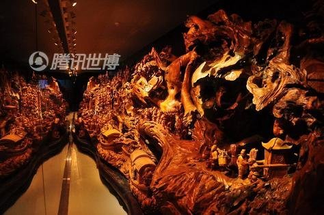 地下藏寶室的另一亮點,是這里展出的18米長,12噸重,2.56米高的巨型根雕《清明上河圖》,近800個不同儀表、不同舉止、不同神情的人物被刻畫得栩栩如生。講解員說,根雕原料是從東南亞進口的一整棵香樟古木,有2300年的樹齡,“35位藝術(shù)家和工匠用了5年時間創(chuàng)作而成,北京一家評估公司認為它的價值大約為5.6億元!