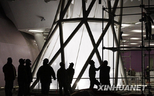 12月25日,工人正在日本國家館內(nèi)調(diào)試燈光。新華社記者 裴鑫攝