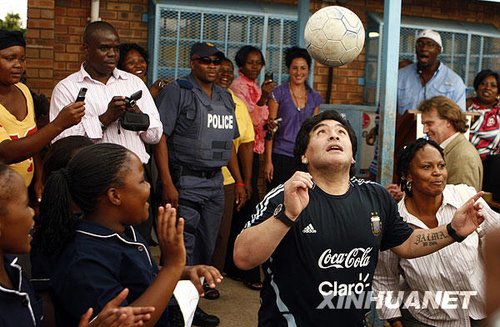 阿根廷國(guó)家隊(duì)主教練馬拉多納(中)受到南非蘇姍古威市一所學(xué)校學(xué)生的歡迎。新華社資料圖