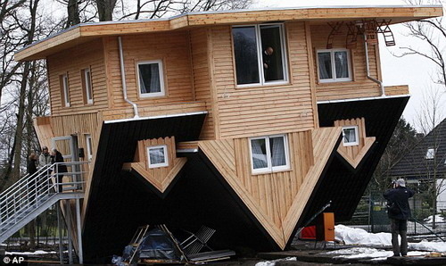這棟房屋高8米,建造在一家動物園內,里面的廚房、浴室、起居室以及臥室中的東西,都與正常房間的擺設相反,所有用具幾乎都是掛在頭頂上的,幸好這棟顛倒建筑不是用來住人的。