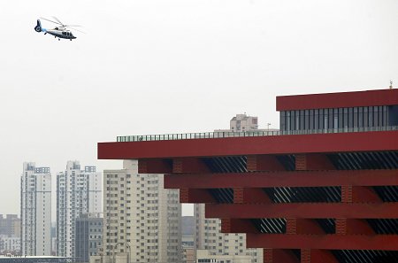 載著航空隊志愿者簽名旗幟的直升機將旗幟送入世博園。早報世博記者 趙昀 圖