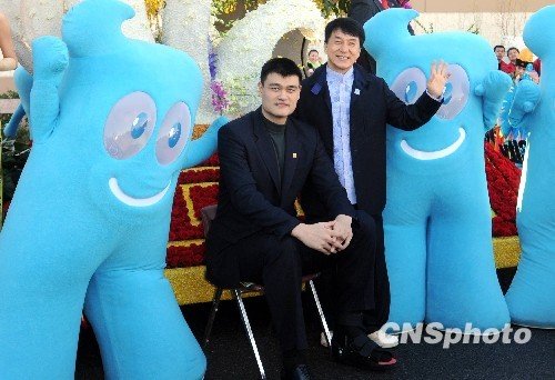 當?shù)貢r間十二月三十一日,剛剛完工的上海世博會花車接受美國帕薩迪納玫瑰花車委員會的評審,NBA中國球星姚明和香港影星成龍抵達現(xiàn)場為上海世博會花車助陣。 中新社發(fā) 張煒 攝