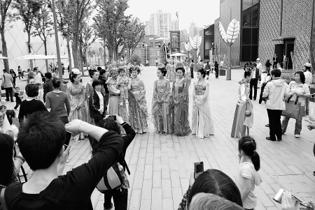 巡游活動不但受到了游客的追捧,還吸引了來世博園取景的德國媒體,他們將鏡頭緊緊鎖定巡游隊伍,拍攝完畢紛紛掏出相機來與唐裝侍女合影留念。