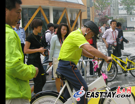 黃綠色的李寧運(yùn)動(dòng)短T,深色的李寧網(wǎng)球褲,白色的李寧運(yùn)動(dòng)鞋,再加一頂黑色的李寧鴨舌帽,今天上午10點(diǎn)半左右,在各路記者的簇?fù)硐拢羧阵w操王子李寧出現(xiàn)在世博會(huì)浦西城市最佳實(shí)踐區(qū),從馬德里案例區(qū)出來(lái)后,出現(xiàn)在了歐登塞展區(qū),看著路邊停放著的一整排自行車(chē),李寧也過(guò)了一把騎車(chē)癮,引起了游客的圍觀。