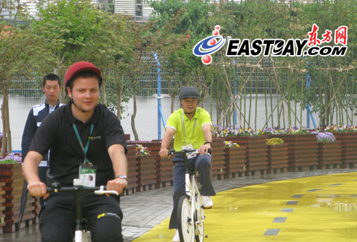 在浦西城市最佳實(shí)踐區(qū)歐登塞展館,昔日體操王子李寧過(guò)了一把騎車(chē)癮