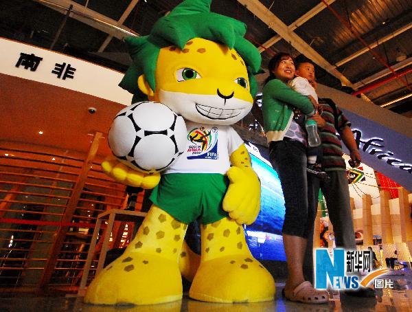 5月7日,游客在世博園南非館與世界杯吉祥物“扎庫米”合影。新華社發(fā)