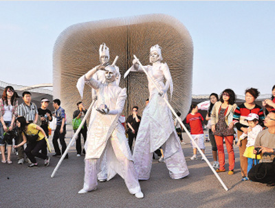 6月1日,上海世博園英國館入館人數(shù)大幅增加,英國館的演員在館外進行一種未來超能量科技球的演示,他們用幽默、夸張的表演與觀眾親密互動。新華社記者 何俊昌攝