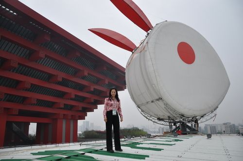 澳門館的玉兔宮燈的兔頭由充氣飛艇的專用織物所造,兔頭可根據(jù)風(fēng)向轉(zhuǎn)動(dòng),保持迎風(fēng)姿態(tài)。