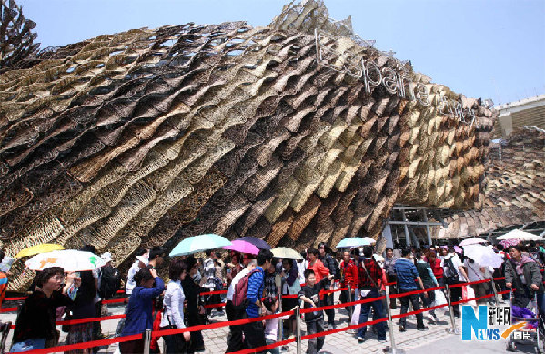 5月1日,參觀者在西班牙館外排隊等候入場。 新華社記者 王迎 攝