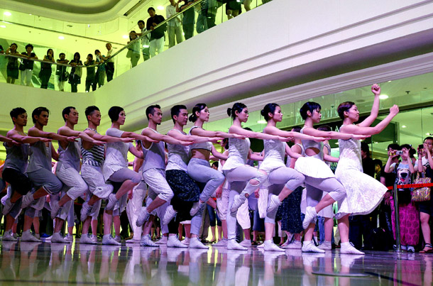 6月20日,香港舞蹈演員在商場(chǎng)里翩翩起舞。當(dāng)日,參加上海世博園文藝演出的香港城市當(dāng)代舞蹈團(tuán),專程來到上海市淮海路上的大上海時(shí)代廣場(chǎng),為南來北往的游客獻(xiàn)上一場(chǎng)主題為《衣食住行》的舞蹈表演。在表演過程中,演員不時(shí)走到購物的游客中間起舞,讓觀眾零距離欣賞走出殿堂的舞蹈藝術(shù)。新華社記者 陳飛 攝