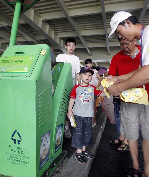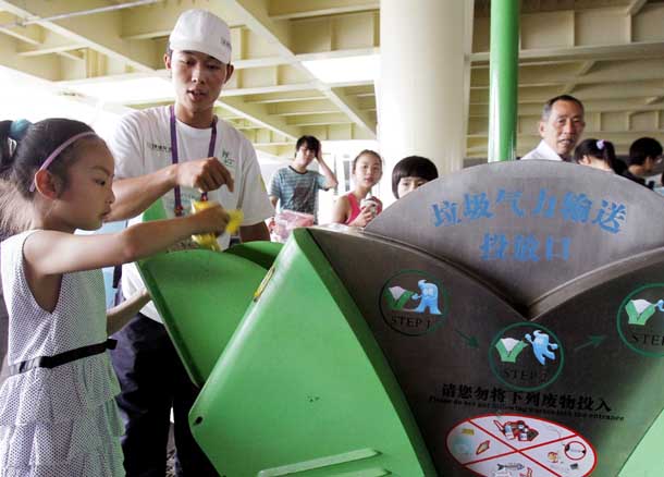 一種非常先進(jìn)的垃圾收集方法——“智能化垃圾氣力輸送系統(tǒng)”已在上海世博園內(nèi)運(yùn)行使用。這套高科技系統(tǒng)吞食垃圾的“嘴巴”——51個(gè)外觀形似嫩芽的智能化垃圾投放口分布在“一軸四館”范圍內(nèi),但尚未被游客廣泛認(rèn)識(shí)。為了讓游客更好地了解和使用,工作人員在園區(qū)內(nèi)進(jìn)行宣傳和演示,使游客對(duì)園區(qū)的高科技和環(huán)保設(shè)施有了更深的了解。