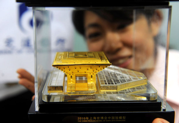 7月7日,在交通銀行北京的一家營(yíng)業(yè)網(wǎng)點(diǎn),顧客觀看上海世博會(huì)中國(guó)館純金純銀模型。近日,一款經(jīng)上海世博局授權(quán),中鈔國(guó)鼎公司出品的以硬金工藝鑄造的中國(guó)館模型在全國(guó)各交通銀行上市,受到投資者及收藏者關(guān)注。新華社發(fā)
