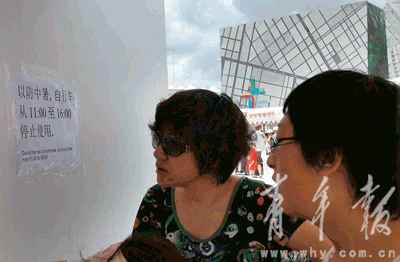 夏日炎炎,為了防止游客因?yàn)樽鰟×疫\(yùn)動(dòng),出汗過(guò)多而中暑,丹麥館(網(wǎng)上丹麥館)采取了自行車禁租借的措施。記者昨天在世博丹麥館排隊(duì)處看到,在醒目的位置貼出了“以防中暑,自行車從11點(diǎn)到16點(diǎn)停止使用”的告示。