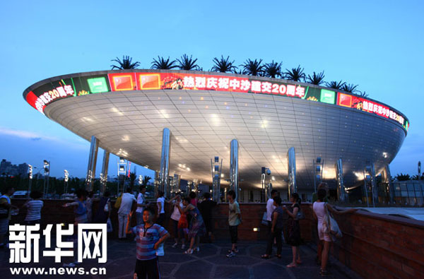 7月21日,沙特館頂部的環(huán)形屏幕打出慶祝中沙建交20周年的字幕。新華社記者 侯俊 攝