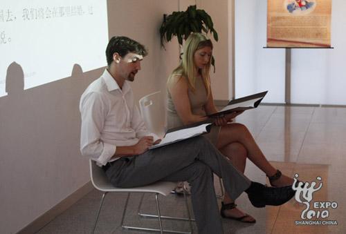 30日下午,在上海世博會愛爾蘭國家館內(nèi),數(shù)十名游客興致勃勃地聆聽兩名愛爾蘭工作人員講述一個古老的愛爾蘭傳說,尤其引人注意的是,其中一個金發(fā)碧眼的愛爾蘭小伙竟是在用中文講故事。