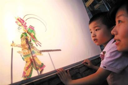 昨天,小游客在世博園區(qū)觀看皮影表演。 (張海峰)