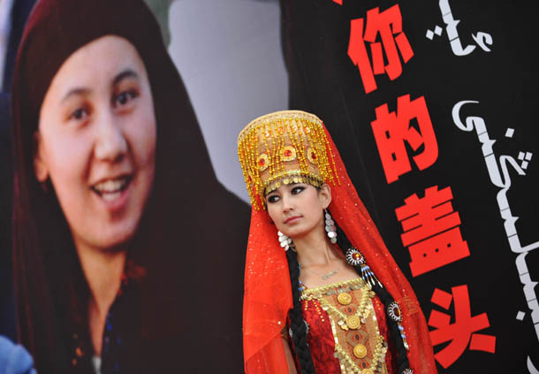 9月26日,一位身穿民族服飾的模特站在《掀起你的蓋頭來·新疆影像2010》宣傳畫旁。新華社記者 趙戈 攝