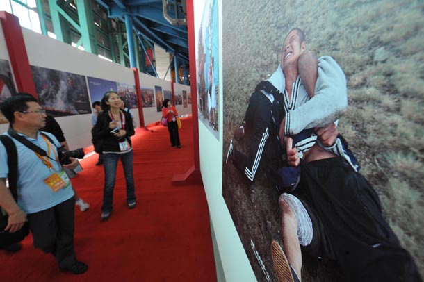 9月26日,游客在參觀《掀起你的蓋頭來·新疆影像2010》攝影展。新華社記者 趙戈 攝