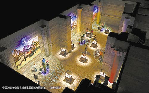 城市足跡館分為三個(gè)展區(qū),分別表現(xiàn)城市文明的出現(xiàn)、成熟,以及全球城市化帶來的挑戰(zhàn)。 展館核心思想是:在走向現(xiàn)代文明的歷程中,人、城市、環(huán)境一直在互動(dòng)發(fā)展。在這個(gè)過程中留下的人類足跡,反映了人類文明的智慧和成就。