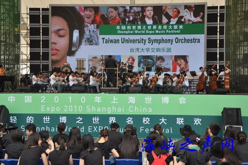 海峽之聲網(wǎng)上海站7月6日電(記者張玉龍)作為中國2010年上海世博會青年周暨世界名校大聯(lián)歡開幕式之后的第一場演出,今天上午在世博會浦西園區(qū)博覽廣場舉行的“臺灣大學(xué)交響樂團(tuán)”專場演出,因為其作品展現(xiàn)了極具臺灣地方特有傳統(tǒng)文化而格外受到觀眾好評。
