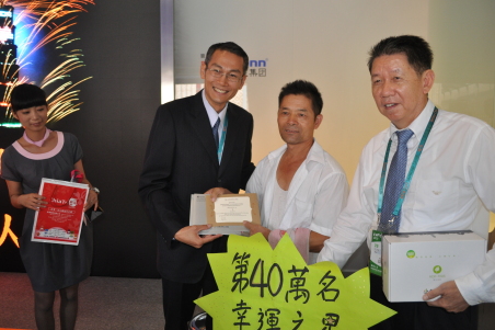 在現(xiàn)場的歡呼聲中,工作人員獻(xiàn)上“第40萬名幸運之星”的牌子,臺北館館長陳慶安也特別致贈臺北名產(chǎn)鳳梨酥、數(shù)碼相框、臺北國際花卉博覽會的邀請卡及花博一日劵二張等禮物給幸運的林金火先生。陳館長也不忘提醒大家,重要的是在上海世博會之后,臺北花博即將于11月6日展開,他邀請大家“相約臺北花博見!”,也歡迎大家到臺北觀光。同時陳館長也宣布同梯次參觀的游客通通有獎,每位都可以在互動體驗區(qū)拍攝臺北景點合成照,引起全場鼓掌。而臺北館陳館長也透露臺北館第50萬名幸運臺北館將會送出更多大獎。