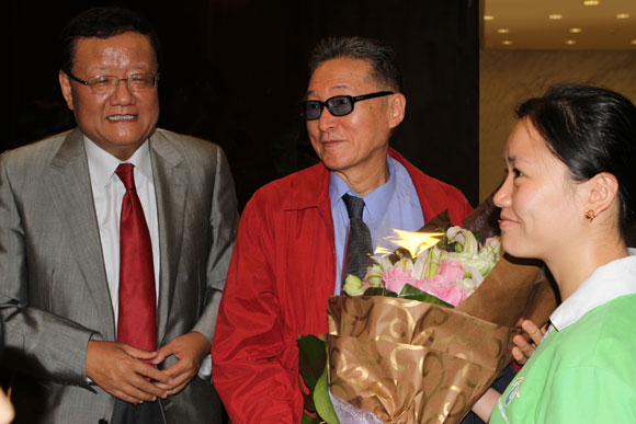 8月26日,世博志愿者在機(jī)場(chǎng)向李敖鮮花。