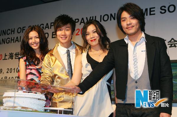 4月19日,新加坡歌手孫燕姿、林俊杰、蔡健雅、阿杜(從左至右)共同出席上海世博會(huì)新加坡館主題曲《感動(dòng)每一刻》音樂電視的首發(fā)新聞發(fā)布會(huì)。新華社發(fā)(朱良城 攝)