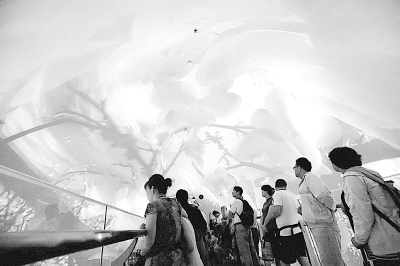 展區(qū)內(nèi)的3D影院,不僅是一個影院,還是一部電梯。它非常特別,是模擬臺北101大樓的觀光電梯設(shè)計的。游客乘坐這部電梯,到101大樓的觀景臺去感受臺北。隨著電梯疾速“上升”,首先讓人感覺到整個臺北市就在你的“腳下”。短短的36秒,觀眾將到達“509米的高空”,宛如精靈的臺北市鳥藍鵲翱翔在清晨的淡水河上空,“36秒”拉開了這個城市一天的序幕:從繁忙的菜場,到臺北風(fēng)格迥異的街頭藝人,再到晚間熱鬧的士林夜市,一切都井然有序地進行著。一張張不同的笑臉,都好像詮釋著同一個概念:城市,讓生活更美好。