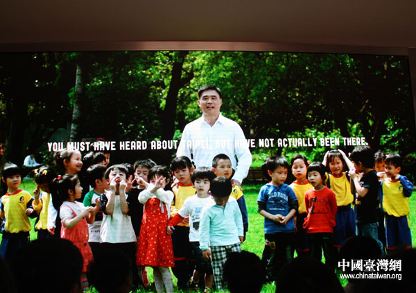 臺北市長郝龍斌也和小朋友們一起,通過宣傳片歡迎人們來到臺北館。(中國臺灣網(wǎng) 張弛 攝)