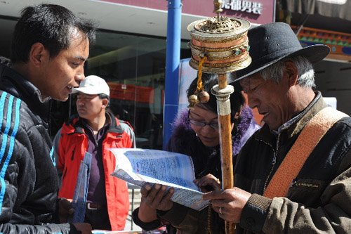 4月3日,拉薩各旅游企業(yè)煩人工作人員向市民贈(zèng)送旅游地圖并做相關(guān)講解。(圖片來(lái)源:中國(guó)西藏新聞網(wǎng) 史雁超 攝)