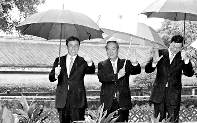 昨天,韓正(左)、親民黨主席宋楚瑜(中)和臺(tái)北縣長(zhǎng)周錫瑋在林家花園向媒體揮手致意。新華社發(fā)