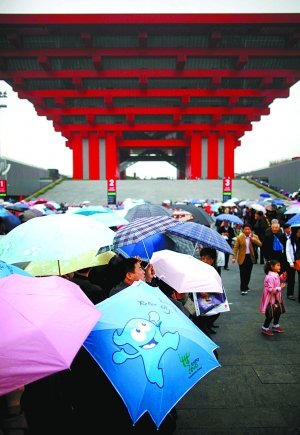 4月20日,游客雨中撐傘等待進(jìn)入中國館參觀。本報記者 王申 攝
