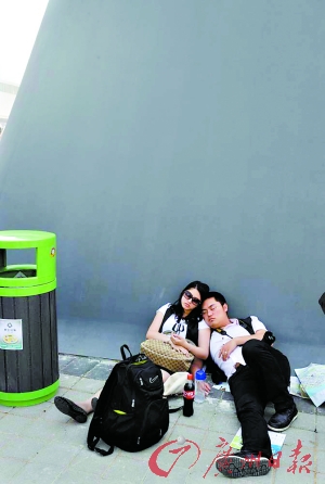 一對情侶逛累了,就地坐下打盹