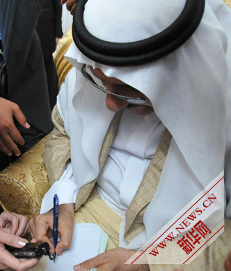 2010年5月1日,世博園正式開園,沙特阿拉伯王子曼蘇爾 本 穆泰 本 阿布扎勒 阿齊茲為沙特館開館儀式剪彩,并接受新華網(wǎng)專訪。圖為曼蘇爾王子為海內(nèi)外新華網(wǎng)友留言