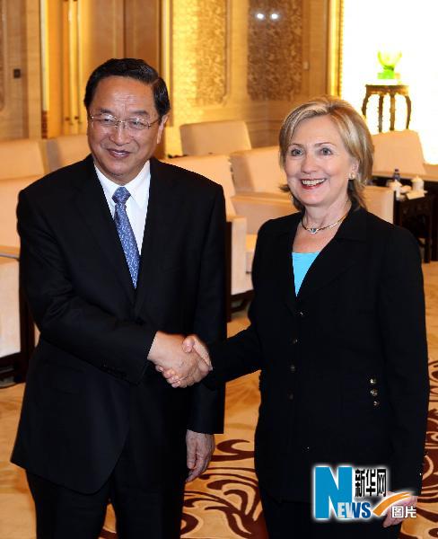 5月22日,中共中央政治局委員、上海市委書記俞正聲在上海世博中心會見美國國務卿希拉里·克林頓。