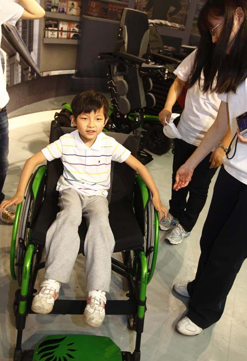 5月31日,小克梅在生命陽光館內(nèi)體驗(yàn)殘疾人使用的新型輪椅。新華社記者 裴鑫 攝