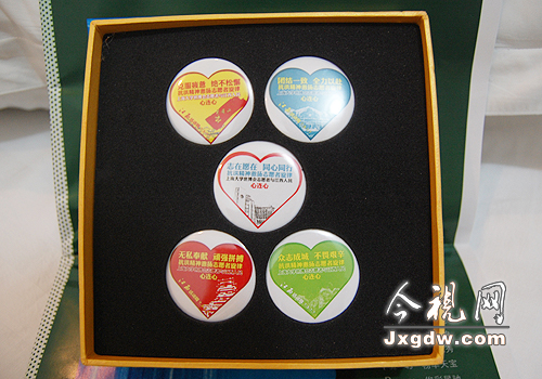 為了更好的配合江西活動周的開展,同時以抗洪精神更好的激勵志愿者做好世博服務(wù),上海大學(xué)志愿者們親手設(shè)計了一套“同心”章,分別以江西井岡山、瑞金、滕王閣、三清山、上海大學(xué)圖書館為象征,發(fā)放給出席活動周開幕式的抗洪搶險英雄代表和嘉賓及游客。