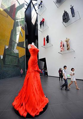 在意大利館的廣場上,杜嘉班納、范思哲、普拉達(dá)、杰尼亞設(shè)計的奢侈品服裝最招女人青睞,4個3.5米高的大型服裝模特與12個裝點墻壁上的常規(guī)模特前往往站滿了人,范思哲剪裁獨具匠心的紅裙往往吸引最多女人的目光。