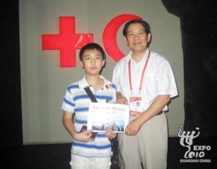 17日下午,上海世博園區(qū)突降雷暴雨,但疾風(fēng)暴雨擋不住人們的觀博熱情。在雷雨聲中,國際紅十字與紅新月館迎來了第60萬名參觀者。這名幸運(yùn)游客是來自廣州市華僑外國語學(xué)校的12歲少年涂遠(yuǎn)哲。小遠(yuǎn)哲高興地戴上紅十字帽子,換上紅十字館T恤衫,儼然成為一名小小的紅十字志愿者。隨后,涂遠(yuǎn)哲和媽媽一起參觀了紅十字館。
