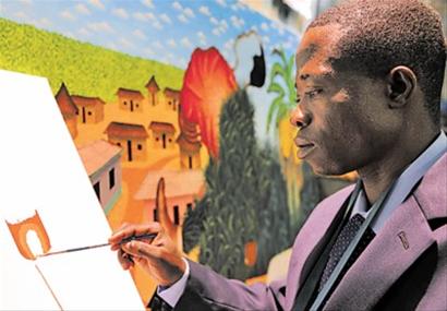 著名畫(huà)家塞納正在中非館作畫(huà)