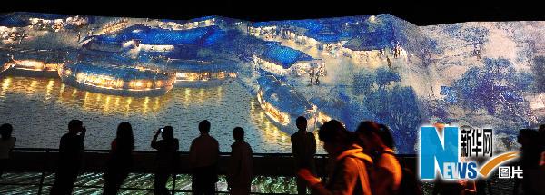 觀眾在中國(guó)國(guó)家館觀看以現(xiàn)代多媒體技術(shù)演繹的《清明上河圖》夜間景致。新華社記者徐家軍攝 資料圖片