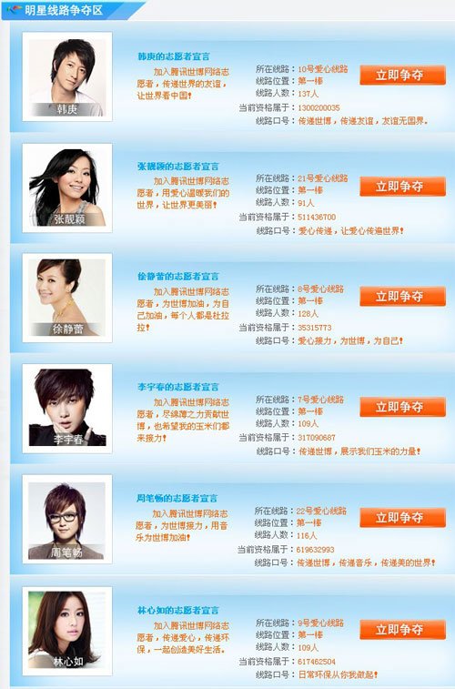 韓庚李宇春等眾多明星邀請(qǐng)網(wǎng)友加入世博網(wǎng)絡(luò)志愿者接力